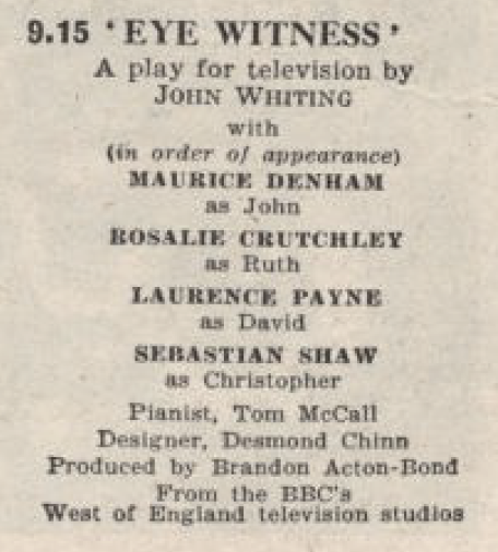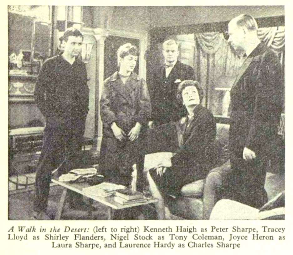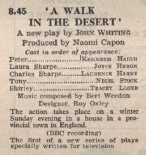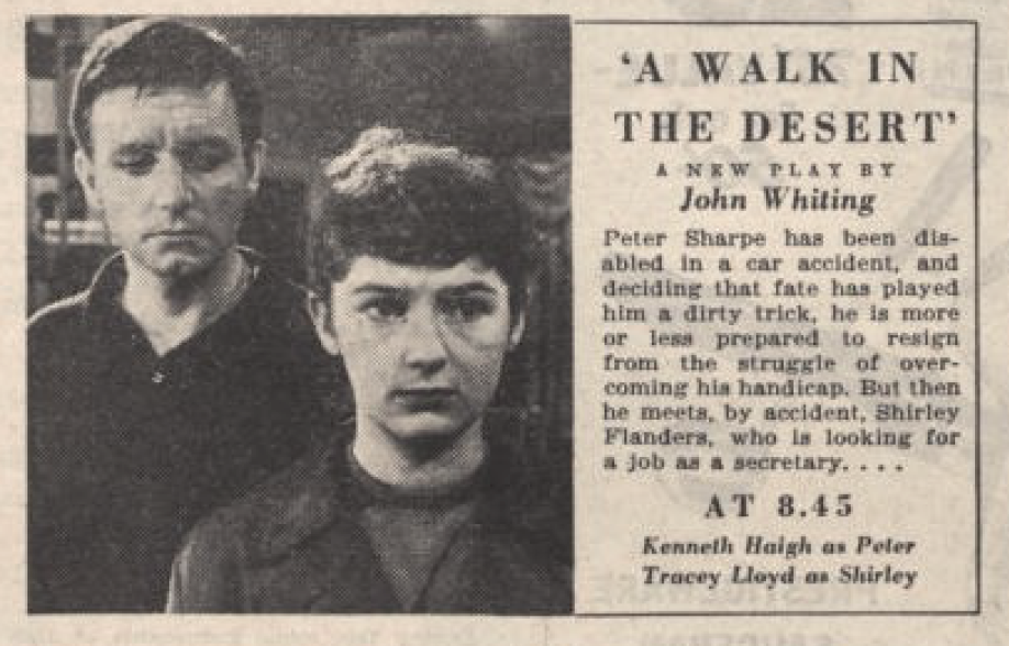 Before A Walk in the Desert Whiting had also adapted his radio play Eye Witness for television, broadcast in a half-hour slot from the West of England studios in October 1957 and even less well-known. ‘Promises to be a real thriller,’ is all that Radio Times tells us. Somewhat unusually for a television play A Walk in the Desert has been published, in Plays 2 now available from Bloomsbury, but not the earlier production, of which there’s no mention even in the chronology of Simon Trussler’s authoritative critical study The Plays of John Whiting (Gollancz, 1972, accessible via Internet Archive).