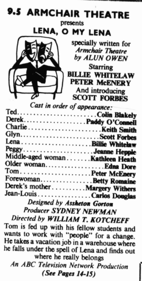 As for the clash with Lena, O My Lena both of the critics who wrote about the pair of productions (one of which at least they must have seen as a preview recording) were exceptionally positive. Lyn Lockwood praised playwright Alun Owen’s ‘deeply imaginative talent, compassionate, understanding and totally uncensorious’, and the writer for The Times enthused about director Ted Kotcheff who they suggested,