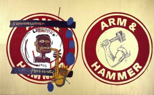 We can see this opposition within their collaborative work, using “Arm and Hammer II” (1985, above) as an example. Warhol painted two images of the Arm & Hammer logo and Basquiat then painted over the first image, depicting a coin at the heart of the logo with ‘liberty’ and ‘1955’ at the top and bottom of the coin respectively with the image of a black man playing a saxophone at its heart.