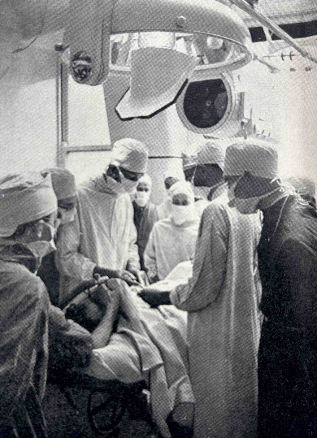 In May 1949 Guy’s Hospital, London, installed the first permanent equipment for televising operations. The television unit was specially designed for this purpose by EMI, and consists of an overhead lighting unit, microphone, and camera, with remote control of movement, focusing, and lens selection (one lens giving a magnified close-up).