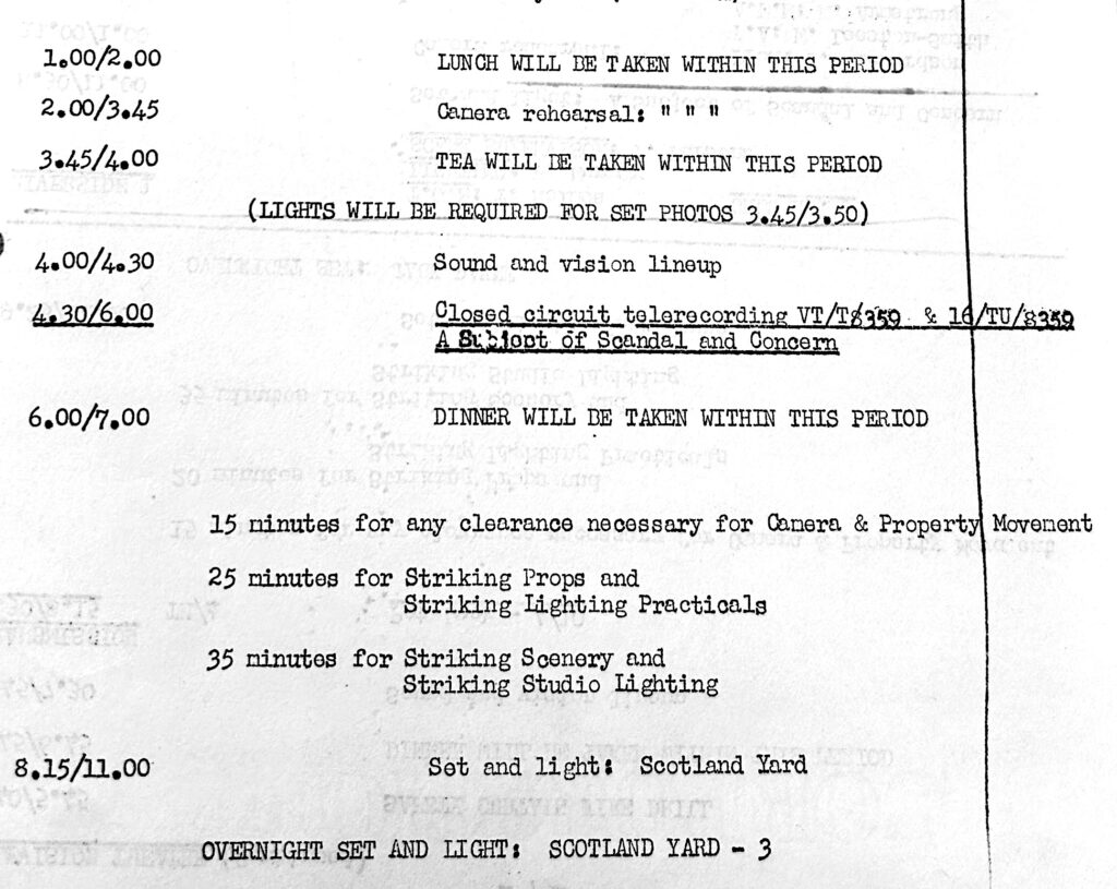 The running order indicates 190 shots in a succession of 14 settings, for a running time of 61 minutes, which gives you a sense of how pressured as-live production was in those days, not only for the cast but also for the incredibly skilled studio crews. After the allocated 90 minutes, Studio 1 needed to be re-set for an episode of Scotland Yard.