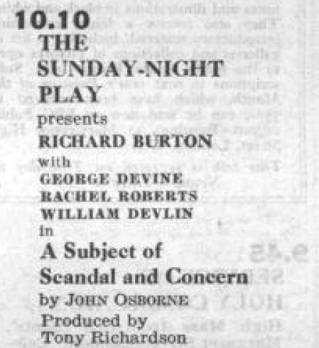 John Wyver writes: Yesterday, as part of the Richard Burton: Muse of Fire season at BFI Southbank I gave an ‘extended’ introduction (that was the request) to a rare screening of the BFI National Archive’s 35mm print of John Osborne’s 1960 television play A Subject of Scandal and Concern. Above is a rather fine BBC image from rehearsals.