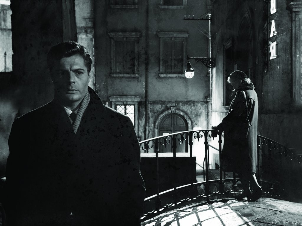 Iannone collides images from Luchino Visconti’s Le notti bianchi (White Nights), 1957, starring Marcello Mastoianni and Maria Schell, illustrated above, with dialogue from the same director’s Death in Venice, 1971, with music from Nino Rota’s sumptuous score to the former, and with quotations from Visconti and cinematographer Giuseppe Rotunno reproduced as on-screen text. The resulting four-minute assembly is provocative and illuminating (about film and theatre, about production design, and about the essence of cinema) as well as being sensuous and quite simply beautiful.