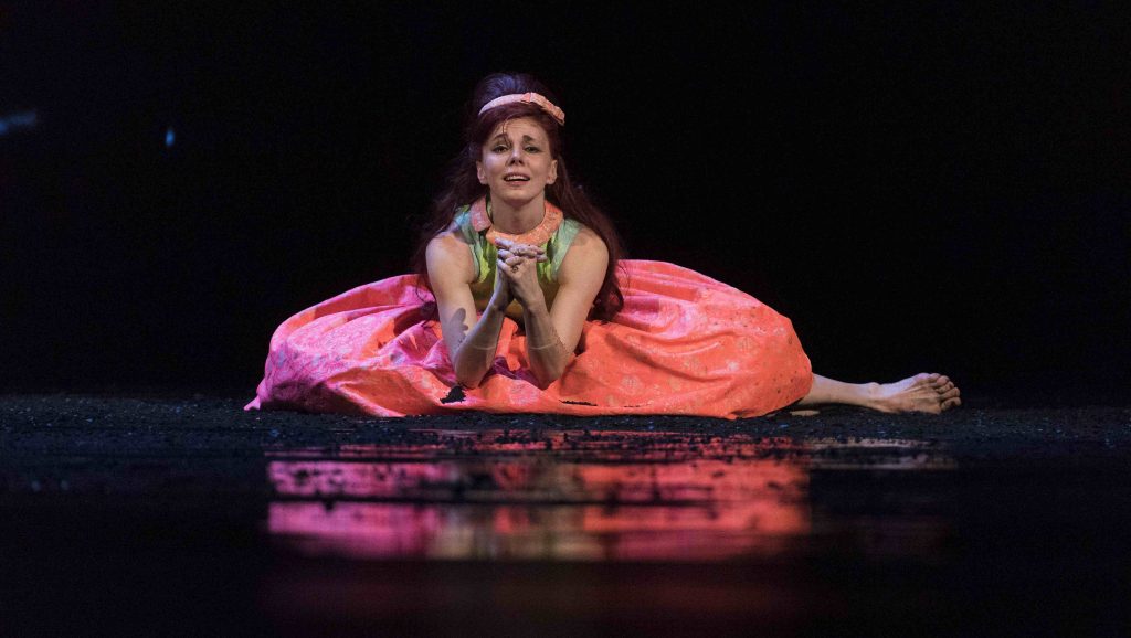 All three of the pieces have minimal settings, and expect evocative lighting to do much of the scenic work. All three are also largely set against black, and so the show as a whole has an austere, minimalist aesthetic. But what that means in Silent Echo is that the screen can explore and exploit changes of scale and radical juxtapositions. Spinning, gliding. leaping, embracing, the two dancers exist both in the space of the stage and – separately, distinctively – in that of the screen. I admired it as I watched from two-thirds of the way back in the Sadler’s Wells stalls, but in front of a screen I was involved, almost mesmerised, in a quite different manner.