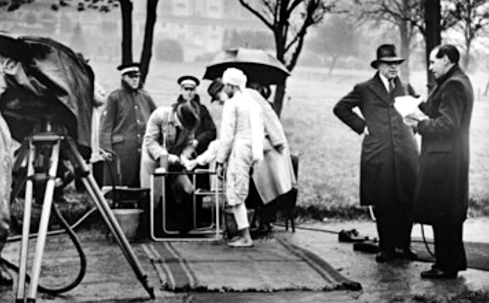 John Wyver writes: On what from production photographs looks like a rainy Tuesday afternoon on 20 April 1937, the fledgling Television service at Alexandra Palace, ever in search of noteworthy elements to broadcast, elected to screen as a local OB from the Park a demonstration of fire-walking. This was arranged by Harry Price (in the hat, second from right), of the (unofficial) University of London Council of Psychical Investigation, and was undertaken by Indian magician Ahmed Hussain and British amateur fire-walker Reginald Adcock.