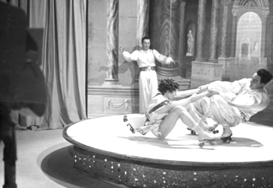 John Wyver writes: This is a cautionary little tale about the perils of live television – and of roller skating. The main offering on the evening of Saturday 21 January 1939 was producer Harry Pringle’s Cabaret bill featuring comedy xylophonist Sid Plummer, funny stories from Gene Plummer, Gene Sheldon’s banjo act and The Four Sensational Macks, seen at AP above. The following Monday a page 10 Manchester Guardian story was headlined, ‘SKATERS FALL FROM TABLE – Television Accident’.