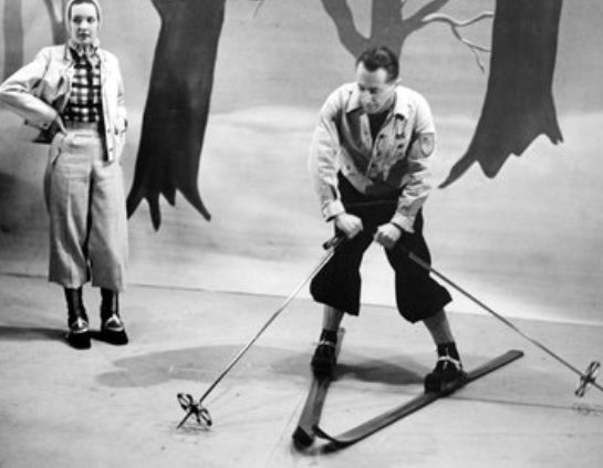 John Wyver writes: In keeping with the aspirational tenor of Alexandra Palace’s lifestyle programming for its professional middle-class viewers, each winter there was at least one studio broadcast for those looking forward to, or dreaming about, a ski-ing holiday across the channel. In 1939 New Year’s Day offered up Snow and Ice, while a year earlier, on 30 December 1937, the schedules were graced by the unfortunately titled Ski Heil (above).