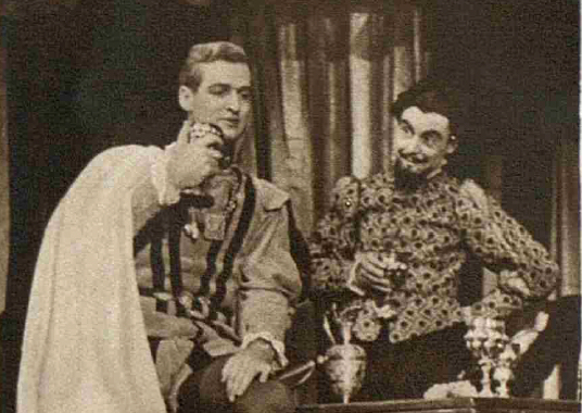 John Wyver writes: OTD, Monday 29 November 1937, from the BBC’s ‘high definition’ Television service… more Shakespeare. Scenes from Cymbeline, broadcast from 3.39pm to 4.24pm, and then again from 9.31pm to 9.55pm, was a presentation of minimally restaged elements of André van Gyseghem‘s production at London’s Embassy Theatre, which had opened 13 days previously. The image above, taken from The Sphere, 11 December 1937, shows Geoffrey Toone as Posthumus and Mario Francelli as Philario.