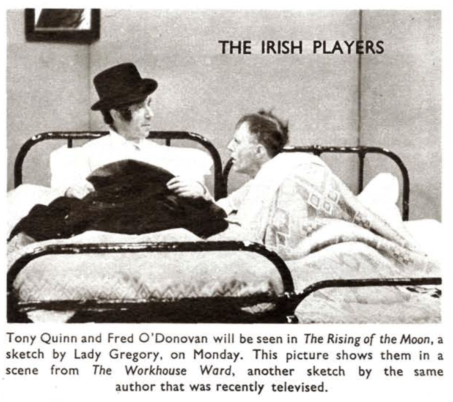 John Wyver writes: on the afternoon of this day, Friday 3 December 1937, four members of The Irish Players came to Alexandra Palace at short notice to play Lady Gregory‘s one-act drama The Rising of the Moon. They were a late replacement for Laurence Olivier and Judith Anderson who were booked to give scenes from Michel Saint-Denis’s Old Vic production of Macbeth. But that theatre’s powerhouse, Lilian Baylis, had died just a week before and those giving the Scottish play, to which we will return, postponed their visit. Remarkably, The Rising of the Moon is one of the very few pre-war television dramas of which we have something like a moving image record.