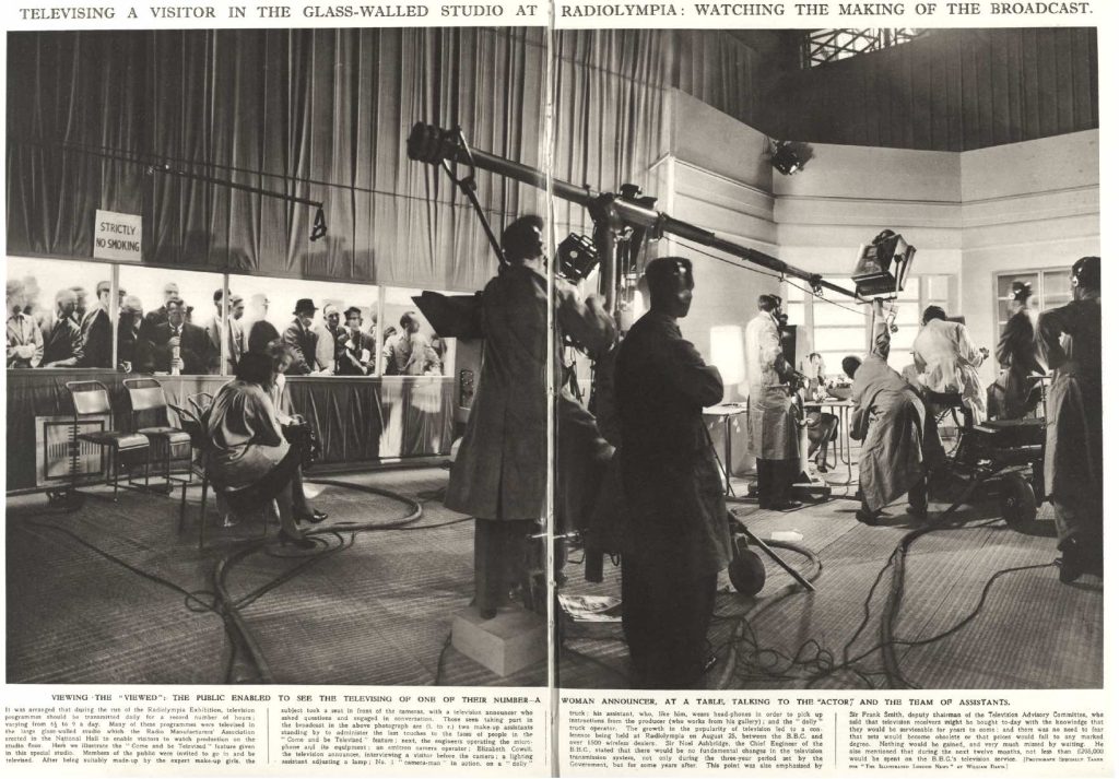 John Wyver writes: Perhaps this is a bit of a stretch but I want an excuse to return to 1938’s Radiolympia which closed ‘yesterday’. So I’m speculating that Sunday 4 September would have been the day when a crew dismantled the BBC’s elaborate Peter Bax-designed glass-walled temporary studio from which the BBC had been televising for some eight hours a day for the duration of the fair. Which gives me licence to feature the above truly remarkable photograph (taken by William Davis) from a spread in the Illustrated London News.