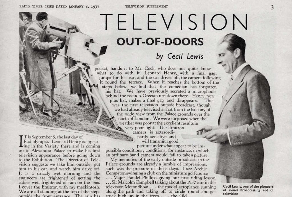 John Wyver writes: One last Radiolympia post, this time from the final day of the 1936 edition, Saturday 5 September. On this day producer Cecil Lewis, a radio pioneer and soon to be tempted to Hollywood to adapt his memoir of being a First World War fighter pilot, pulled together the first ‘local’ outside broadcast at just after midday. He recalled the occasion for Radio Times early in January 1937; this is his account.