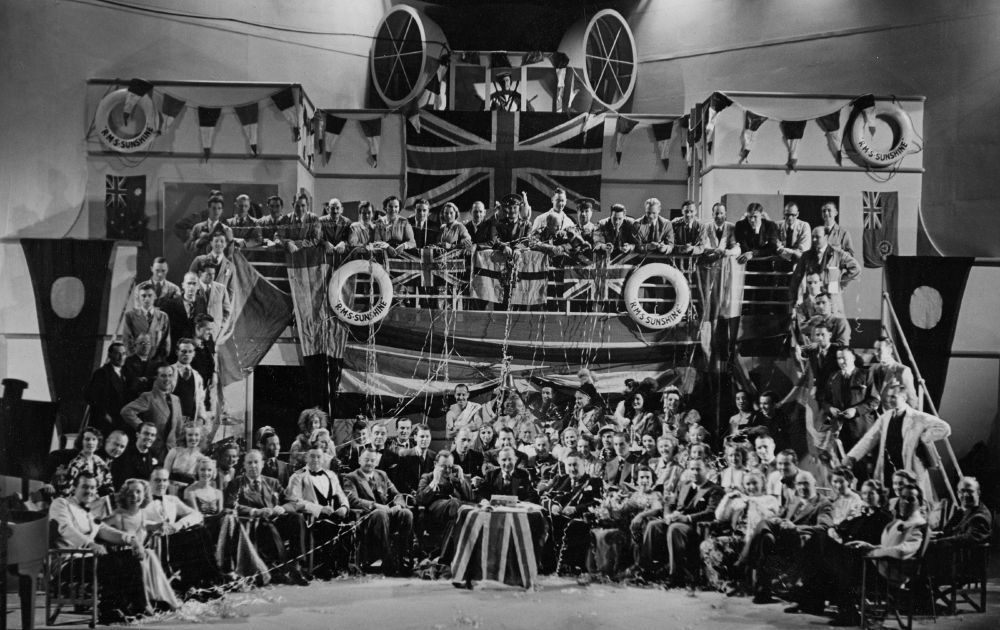 John Wyver writes: I have one further Radiolympia post to come tomorrow, but today (with apologies for the lateness and brevity of the post) marks the last day of the 1938 edition. This closed on the evening of Saturday 3 September with, first, a gala fancy dress edition of Cabaret Cruise and then a spectacular Review programme. Look at the detail in the BBC publicity image above, which shows that by around 10pm the set was crowded with ‘all available artists, BBC staff and RMA [that is, Radio Manufacturers’ Association] staff’, who together sang ‘Auld Lang Syne’.