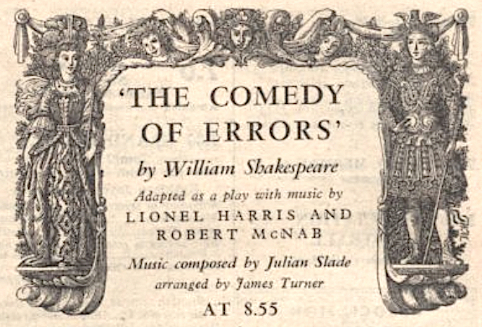 This first post is an odd story which I’m not sure anyone has noticed before. It concerns two television productions of the same musical adaptation of Shakespeare’s The Comedy of Errors. BBC Television first broadcast a studio production of this ‘light operetta’ version on 16 May 1954 (see the Radio Times heading above), with a live repeat on Thursday 20 May. Then, after the show had played in London’s West End, it was re-mounted, with some cast changes but mostly the same creative team, for the eight-month-old ITV service in May 1956. I can think of no other Shakespeare adaptation that has channel hopped in this way.