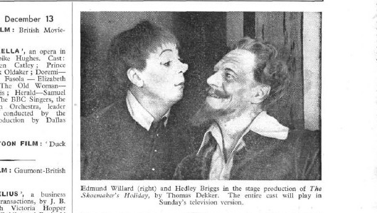Seeing the production renewed my interest in the early television presentation from Alexandra Palace which was broadcast on the evening of Sunday 11 December 1938. No recording exists, of course (the first plays we have are from 1953), no do there seem to be reviews of the television broadcast, but there are traces of other documentation, including a Radio Times billing with the photograph above. Describing the play as ‘a pleasant comedy of the gentle craft’, Radio Times details that the broadcast was based on Nancy’s Price’s production from the Playhouse Theatre.
