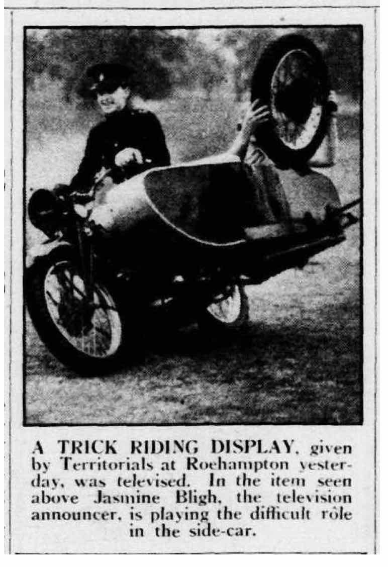On this day Jasmine Bligh took a golf lesson at 3pm from club professional A.G. Matthews, before participating in a display of trick motorcycle riding with nine riders from the London Divisional Signals, Territorial Army. Up-for-anything Jasmine was pictured, both on screen and in the Daily Telegraph the following day, riding in a side-car from which the wheel had been removed.