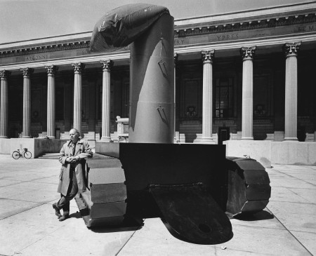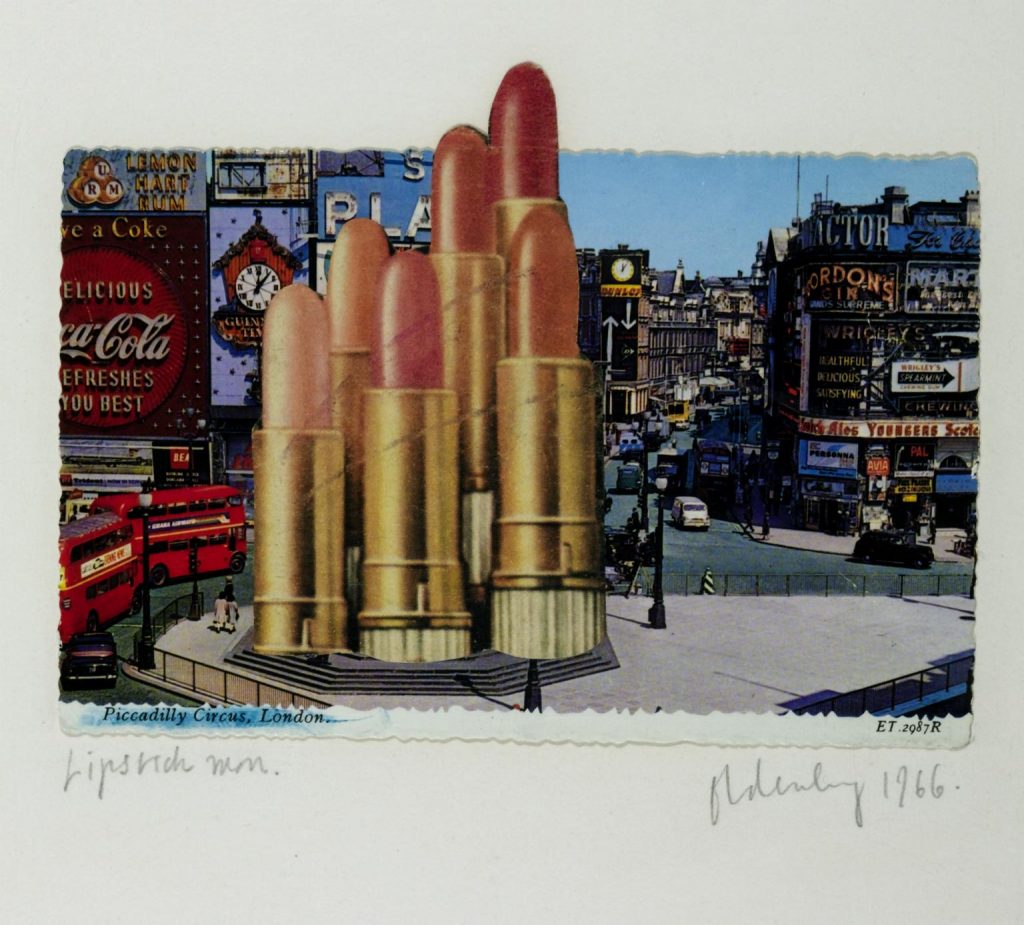 In the early 1960s, he help popularise Happenings, art created as part of a situation, event, or performance. In 1961 he sold models of household objects “in an ironic celebration of mass consumerism,” Andy Warhol had been a customer. The mix of the spectacle from participation in Happenings and the re-production of household objects informed his “soft sculptures” that were also a critique of art history. These were large pieces of public art of objects such as hamburgers and ice cream cones, fabricated using materials that would deflate and appear limp and were subject to gravity and chance. Using materials such as vinyl and kapok rather than marble or bronze was a critique of traditional sculpture and purposefully invoked comparisons with a flaccid penis. Oldenburg was commissioned to produce public art in his alma mater, outside a library at Yale University, “Lipstick (Ascending) on Caterpillar Tracks” (1969) was made as a satire on America’s role in the Vietnam war. London almost got an Oldenburg with his design for a new statue in Piccadilly Circus. Eros would be replaced by a cluster of 8-meter-high orange lipsticks or a skyscraper-sized pair of women’s knees. A postcard collage of Lipsticks in “Piccadilly Circus, London” (1966) is in the Tate collection.