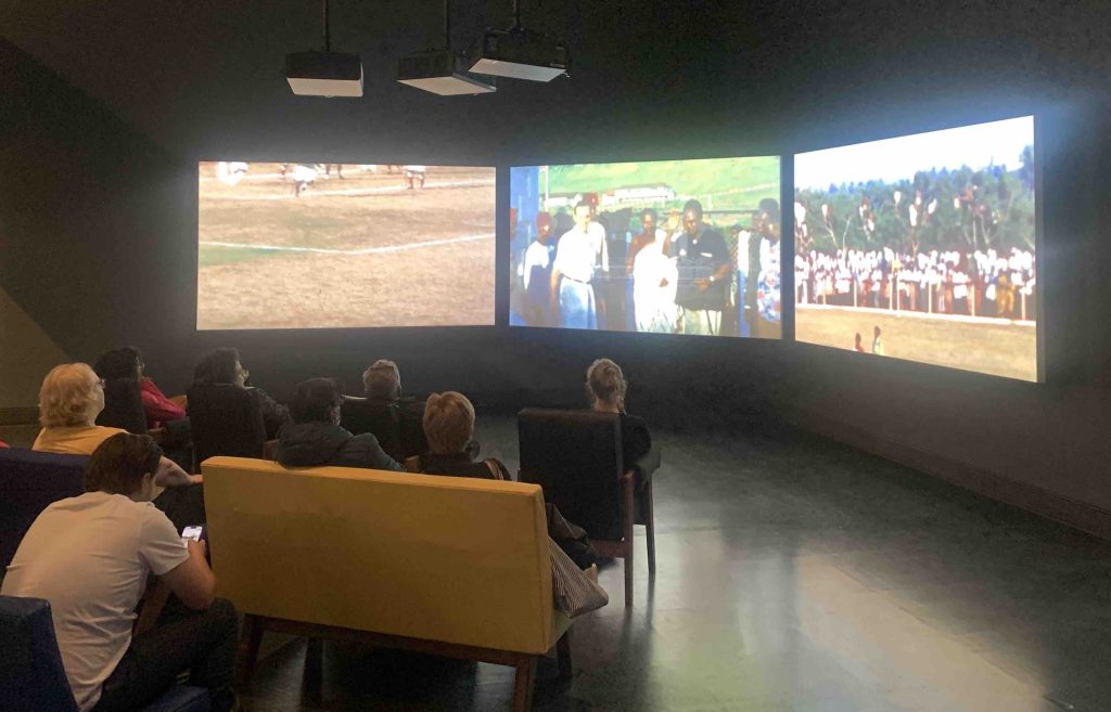 Except, that is, in the final area, where, as is illustrated below, there is a 30-minute film projected across three screens. Originally presented at the Venice Architecture Biennale 2023, this features interviews with architects John Owusu Addo and Henry Wellington, as well as Samia Nkrumah, daughter of Kwame Nkrumah, the first Prime Minister of Ghana, and a narration by Ola Uduku, Head of the School of Architecture at Liverpool University. There are fine sequences shot in many of the key buildings as they are now (often in a rather sad state), as well as additional archive elements.