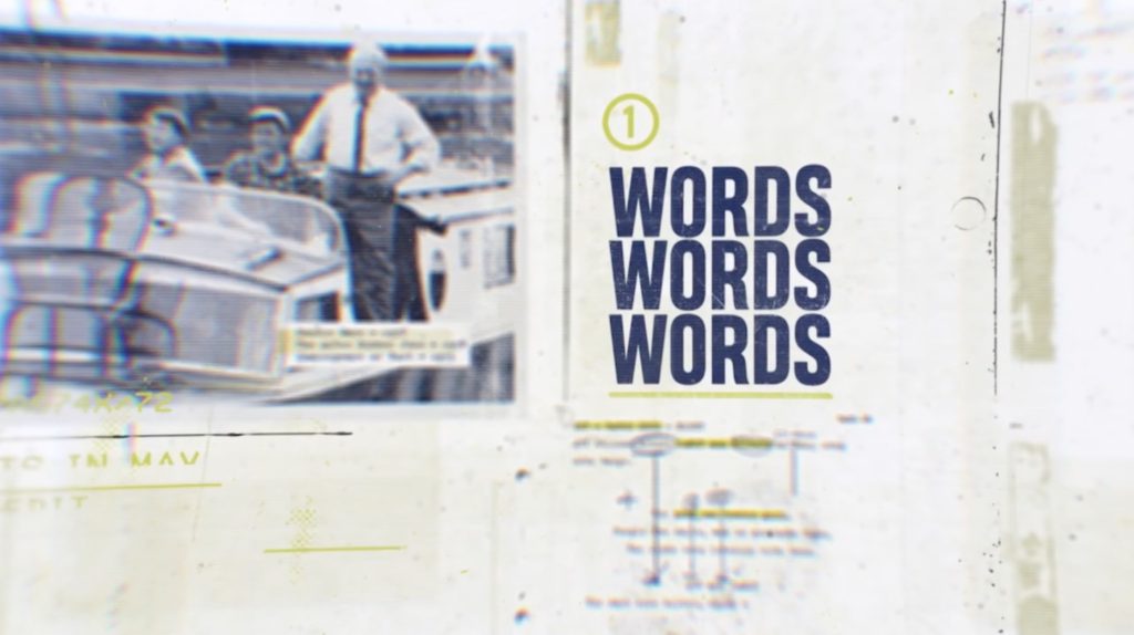 From the beginning I had conceived the film as being structured in chapters, and it was clear that we would need headings of some kind for each section – the final result for ‘Words, words, words’ is above. It also seemed likely that the opening would graphics-heavy to try to get across certain basic facts about the series as well as the breadth of the commissions and the extraordinary range of contributors both before and behind the cameras.