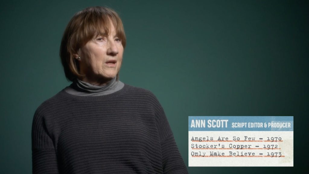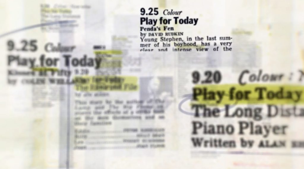 Indeed, the idea of the script as the originary element of every Play for Today became centrally important, with page layouts, punched holes, tape marks and paperclips as structuring elements, along with a typewriter typeface for caption lines identifying writers and directors on extracts and contributing a selection of credits for each interviewee. One other crucial component was the materiality of both filmmaking and recording to videotape, so that throughout we have used film ‘flashes’, image break-ups, edge numbers from film prints and the like.
