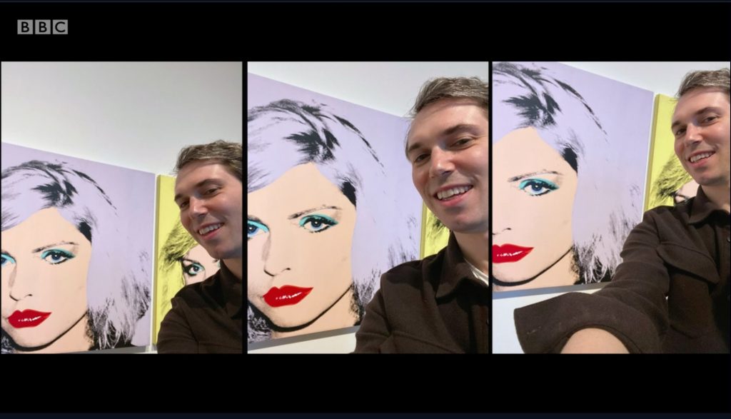 PS. There’s one other difference between the broadcasts by Sir Kenneth and Alastair — the former failed to take a selfie with one of the masterworks on display, whereas the latter did just that, with Warhol’s Debbie Harry, above.