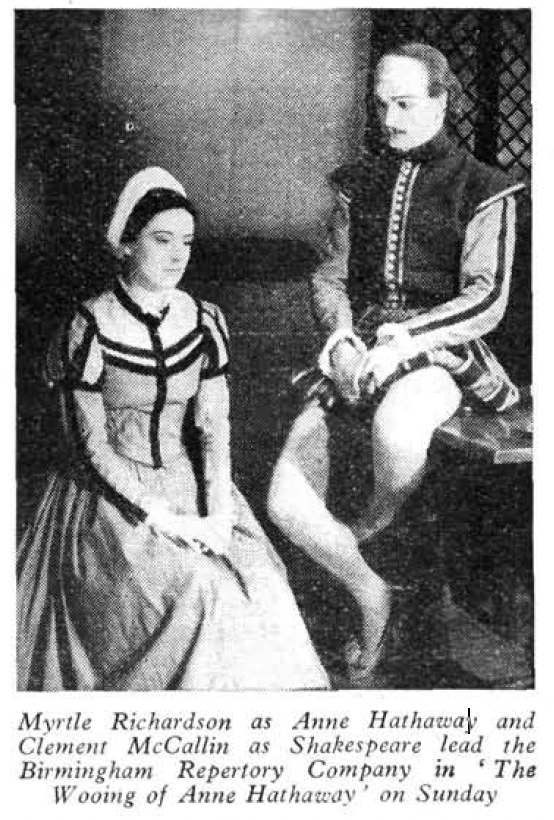 In the play Anne understands her husband’s creative genius and encourages him to go to London to become a playwright. ‘You are free to go,’ she tells him, ‘I have said so many a time.’ In the Birmingham Rep production Myrtle Richardson played Anne, and Clement McCallin was Will, as can be seen in this theatre publicity still reproduced in Radio Times: