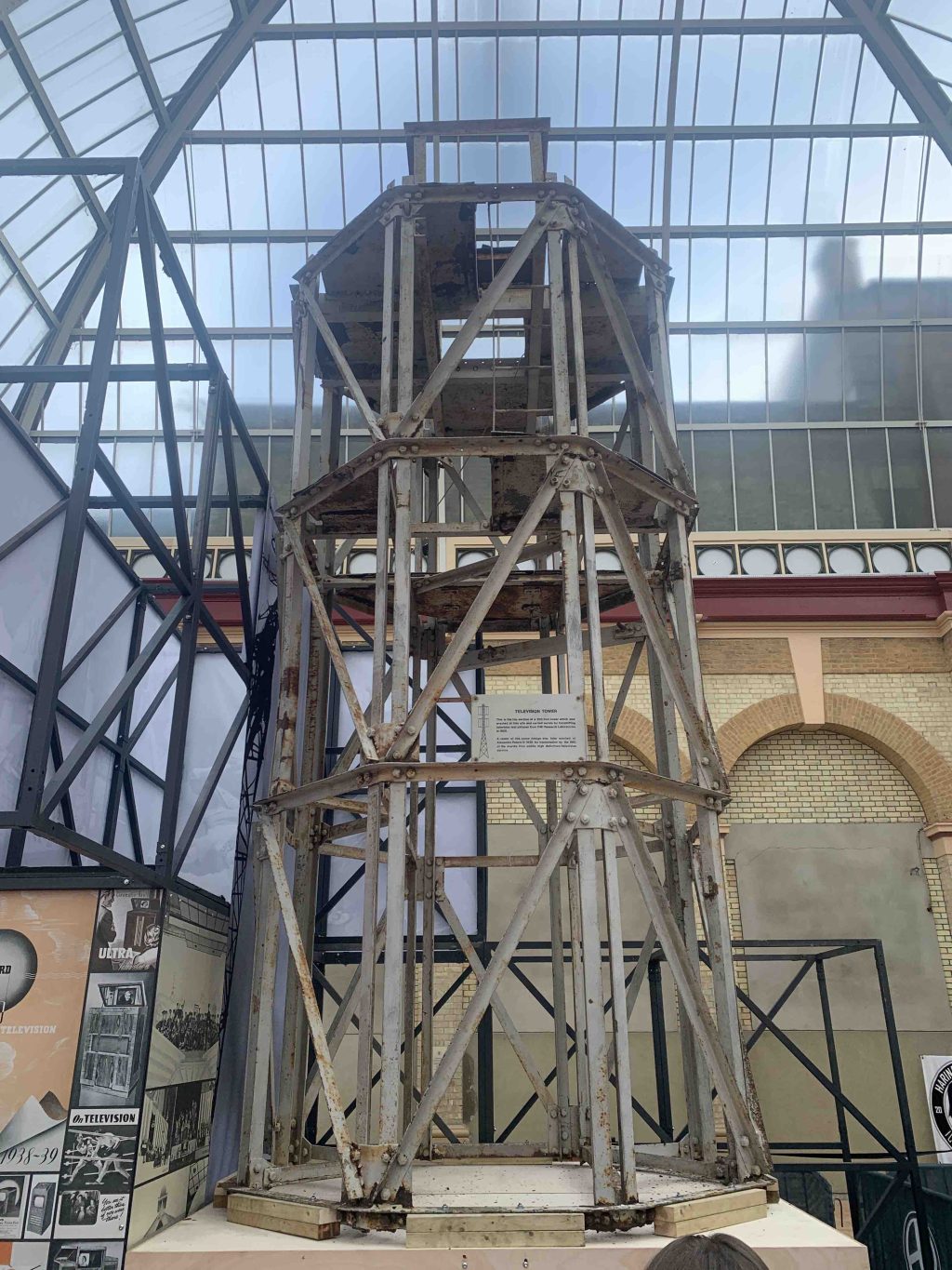 Normal service was resumed the following day. The mast itself still sits on top of AP and remains a symbol of television. Pleasingly, too, in the East Court of the Palace today sits the top section of EMI’s prototype transmitter tower, on which the AP mast was modelled. This was originally built in 1935 at EMI’s laboratories at Hayes, Middlesex.