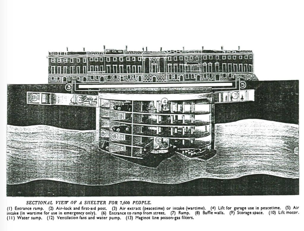 There were to be 15 of these [shelters] spaced around Finsbury borough. In peacetime they would serve as car parks (for which there was also a growing demand as middle-class car ownership rates started to climb). In wartime, they could hold 7600 people (a second design could hold 12300) spaced out along a ramp spiralling downwards around a service core…