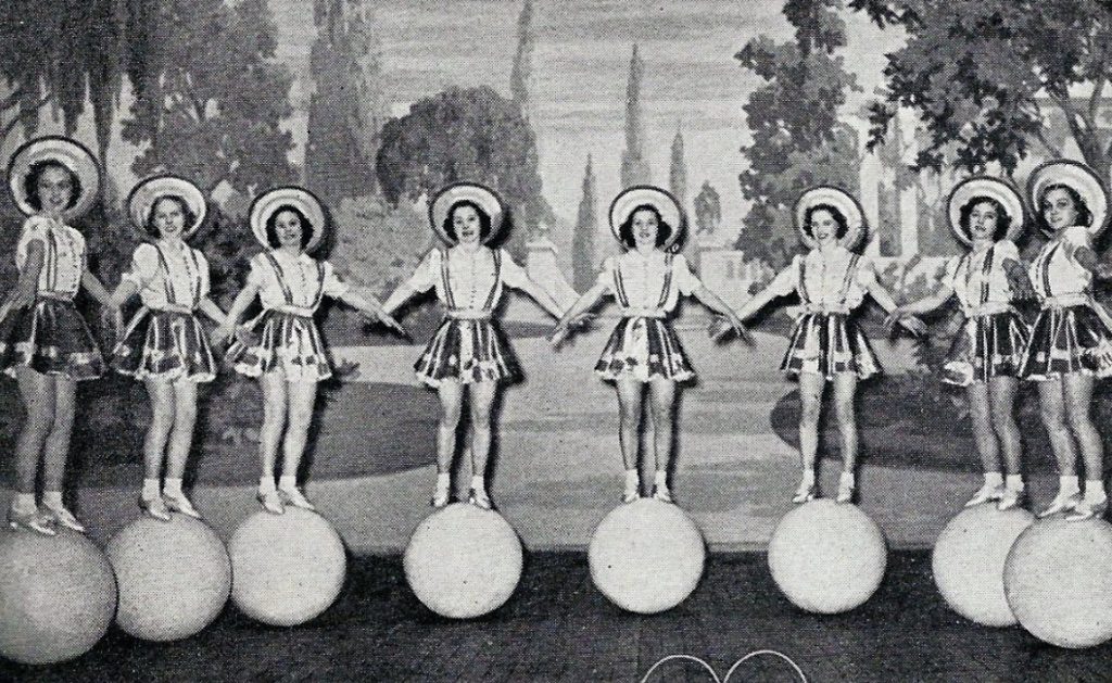 As for the broadcasts, the preview featured shots in the wings and interviews as well as fragments of performance. The noted dame G.S. Melvin and the production’s chorus conjured up the Platonic physical virtues in ‘Health, Strength and Beauty’, ‘Babes’ Beryl May and Pat Warner were interviewed by Tod Rich, OB producer Philip Dorté introduced stage director William Abingdon (presumably the English actor who played in silent films in the United States), and thrillingly there was a glimpse of novelty act, The Eight Betty Hobbs Globe Girls (this is another irresistible image from It’s Behind You).
