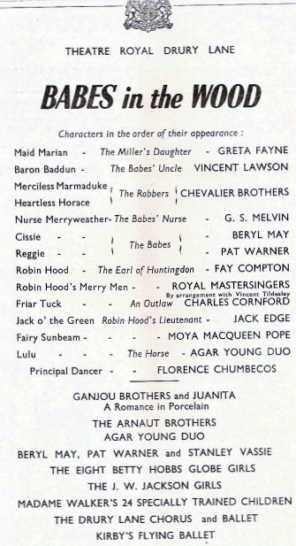 This pantomime marked a return of panto to its ancestral home- Drury Lane. It was presented by Tom Arnold for Julian Wylie Productions… This pantomime was a huge success And ran from December 24th 1929 to March 1st 1930. It starred Fay Compton, GS Melvin and Jack Edge… It featured a star cast, the country’s top speciality act, and the flying skills of Kirby, and a large number of sibling performers- Ganjou Brothers, Arnaut Brothers and the Chevalier Brothers!
