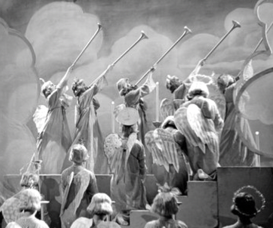 For act 2, Andrée Howard, who in early 1937 had choreographed her celebrated Death and the Maiden for Ballet Rambert, staged an elaborate dream pantomime which photographs of the scene (above) record involved a spectacular chorus of angels. The 22-piece BBC Television Orchestra, conducted by Hyam Greenbaum, was supplemented with eight additional instrumentalists.