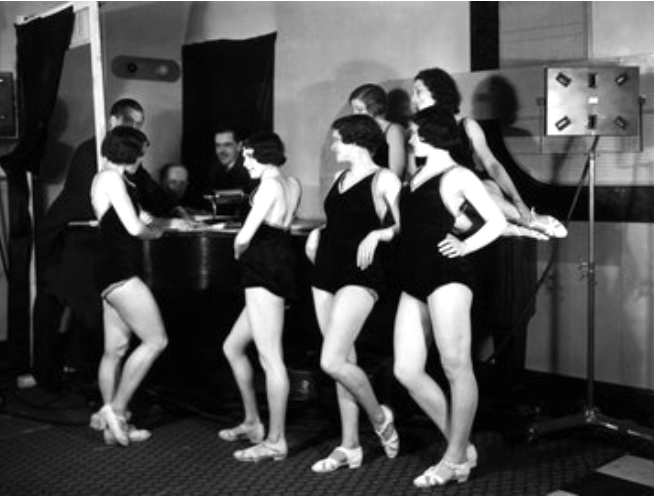 Six Paramount Astoria girls were picked for the show from a team of twelve, trained by Mrs Rodney Hudson. They all wanted to come along, and selection was difficult. Colouring was the decisive factor: blondes do not show well in an extended picture [that is, a long-shot] before the white screen and brunettes were chosen.