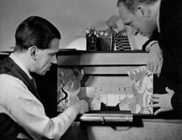 John Wyver writes: From 11.12pm on Friday 21 April 1933 viewers fortunate enough to own a 30-line television receiver could watch the half-hour Looking In, billed as ‘the first television revue’. Written by John Watt with music composed by Harry S. Pepper (that’s them above, with their set for the revue for Radiolympia in 1933), this featured ‘celebrated Première Danseuse’ Iris Kirkwhite, singer Anona Winn, and comedians Veronica Brady, Horace Perceval and Reginald Purdell, plus six of the Paramount Astoria Girls along with a band of four. All marshalled into a 40-minute broadcast by producer Eustace Robb.