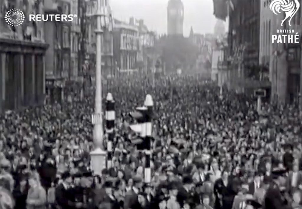 A Pathé newsreel of the events of the day (from which the stills her are screengrabs) gives some sense of how much excitement this occasion prompted. The throngs of watchers in the streets seem simply astonishing to our eyes today.