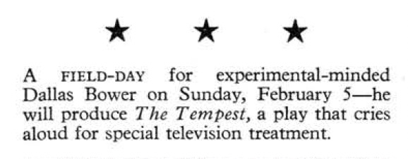 Emboldened by the success of Julius Caesar, Bower planned the ambitious staging of The Tempest. At the start of the year, and again the focus of an earlier post, he worked on an outside broadcast from the West End of Twelfth Night, with Peggy Ashcroft as Viola, and the actor asked for the part of Miranda.