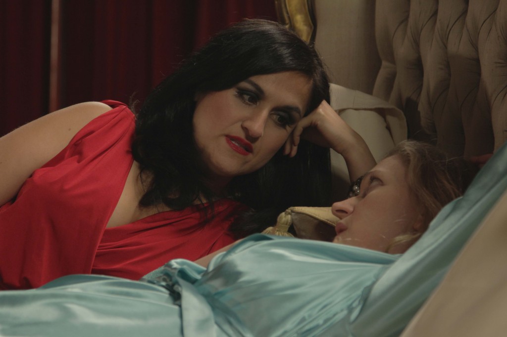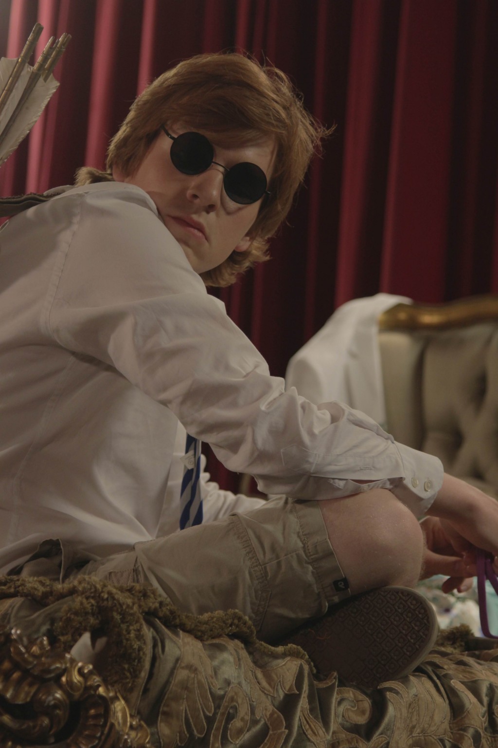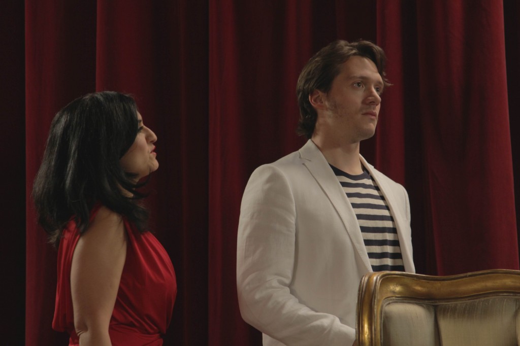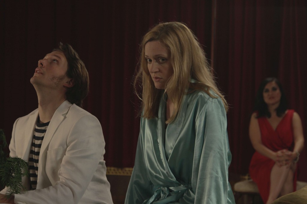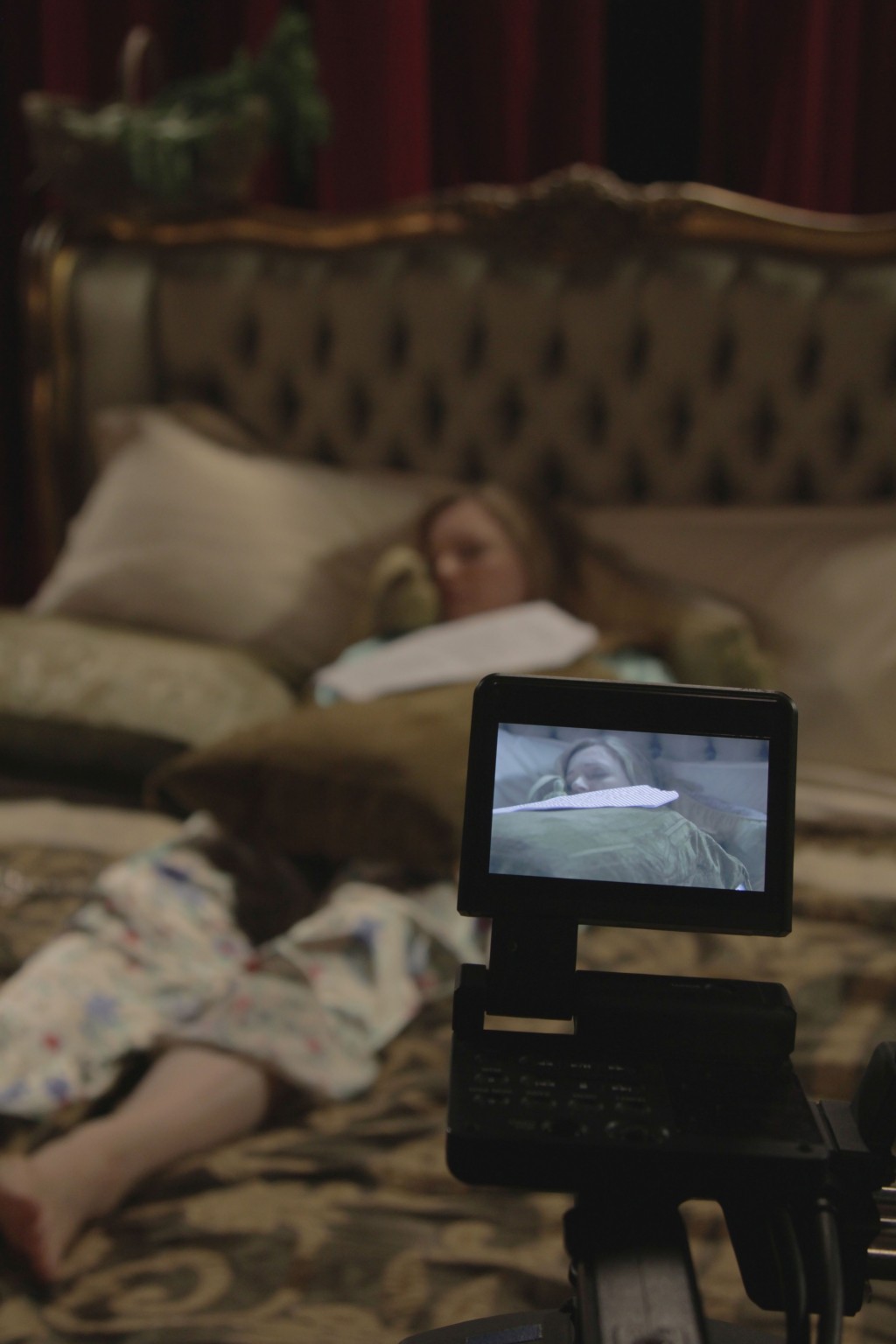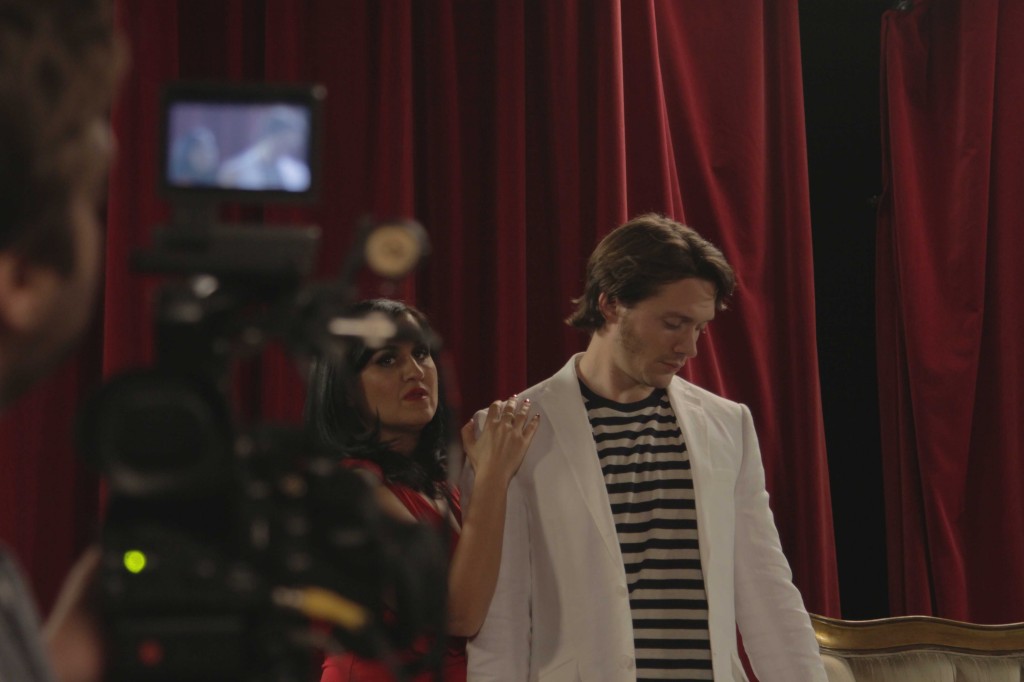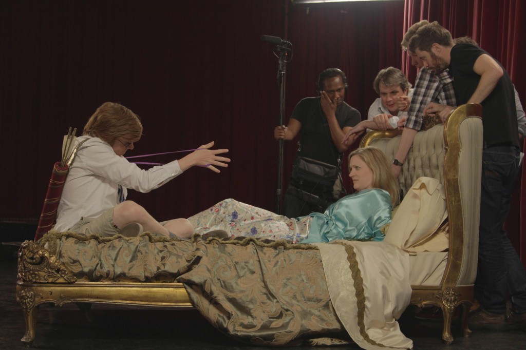 Above, Ray Lyttleton (sound recordist), director James Wallace, director of photography Marc Rovira (hidden) and first AD Tor Kristofferson (who is also editing) set up a shot with Robert Heard (Cupid) and Claire Price (Sapho).