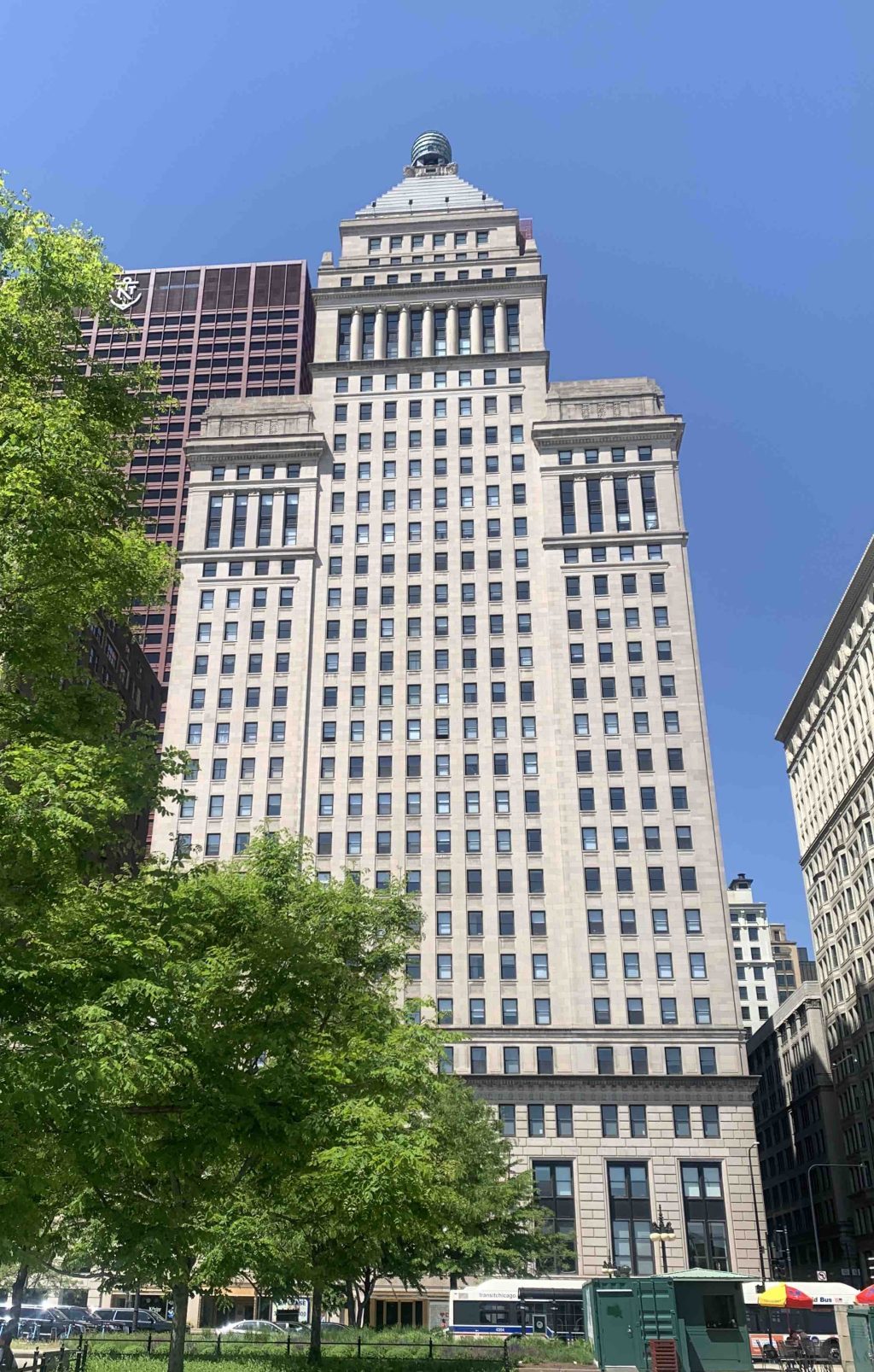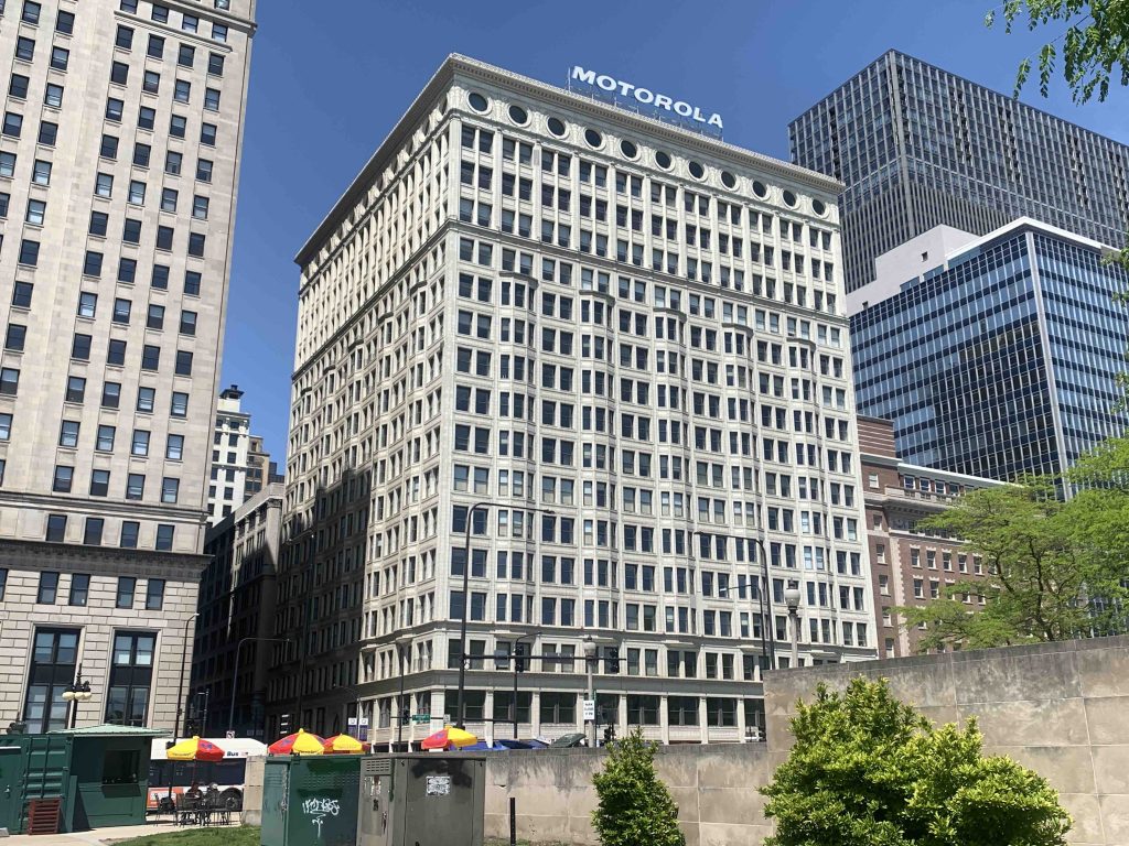 All the central area is very walkable, but the CTA transport pass for all the subways and buses, including to and from the airport, is an incredible bargain at just $25 for 7 days. And pretty much anywhere you can sit and look for the longest time at more or less any building, as I did with what was the Railway Exchange at 224 S.Michigan (below, with the Motorola sign), a Daniel Burnham structure from 1904, with a white-glazed terracotta skin, a concealed air well and a top floor of porthole windows. It was here, I discovered, that Burnham and colleagues worked out the details of the hugely consequential 1909 Plan of Chicago.