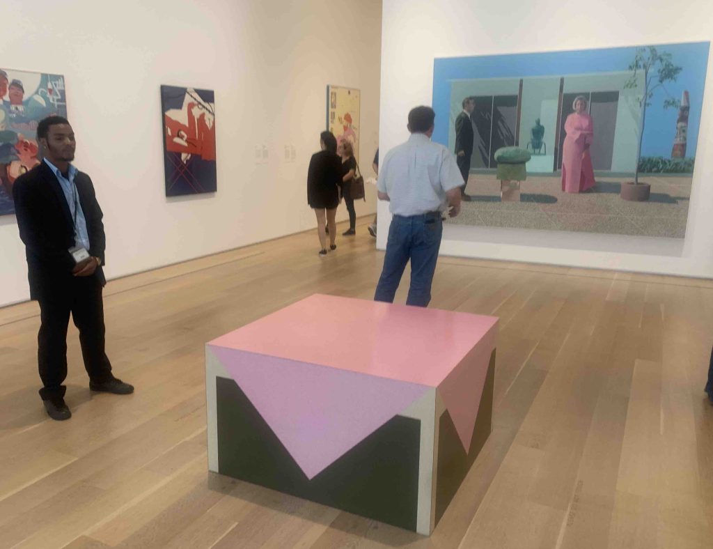 One especially engaging yet weird juxtaposition of two modern artworks is Richard Artschwager’s Table with Pink Tablecloth, 1964, set plumb in front of David Hockney’s American Collectors (Fred and Marcia Weisman), 1968. The Artschwager is in exactly the position, and at the right height, for a seat to rest on while you gaze at David’s draughtsmanship. Which is what almost everybody must go to do, to such an extent that the museum posts a guard there every minute of the day to prevent exactly this. The young man occupying this role while we were there was engagingly wry about the necessity of the position, but we couldn’t help wondering why the Artschwager couldn’t be displayed elsewhere.