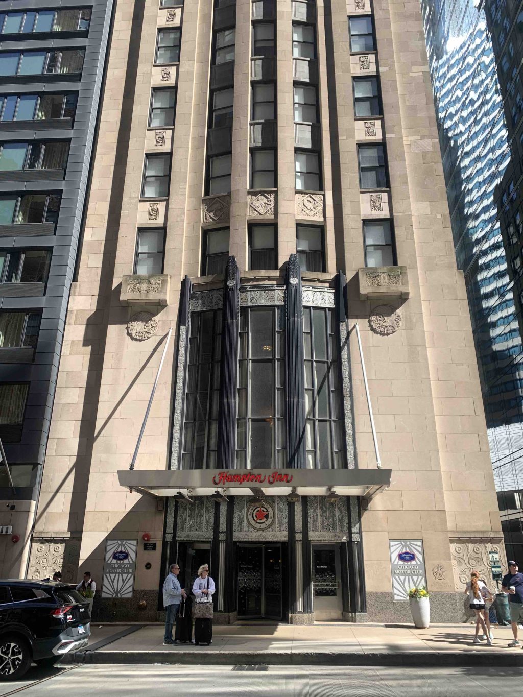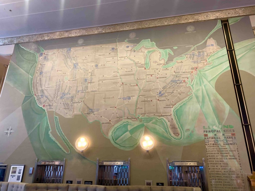 On the ground, I have a digital copy on my iPad of the American Institute of Architects Guide to Chicago, which is the nerdiest city guide you can imagine, packed with info and listings and maps and photos and history, all laid out in a frustratingly opaque manner. But if you work at it, it’s the best possible companion (loved ones excepted, natch) and it means you can simply stumble across glory after glory. Like the old Chicago Motor Club building at 68 E. Wacker Place, now a Hampton Inn, but with exquisite Deco detailing, automobile echoes in the styling of the facade, and in the lobby (and there are so many lobbies to walk into!) a glorious touring USA mural by John W. Norton.