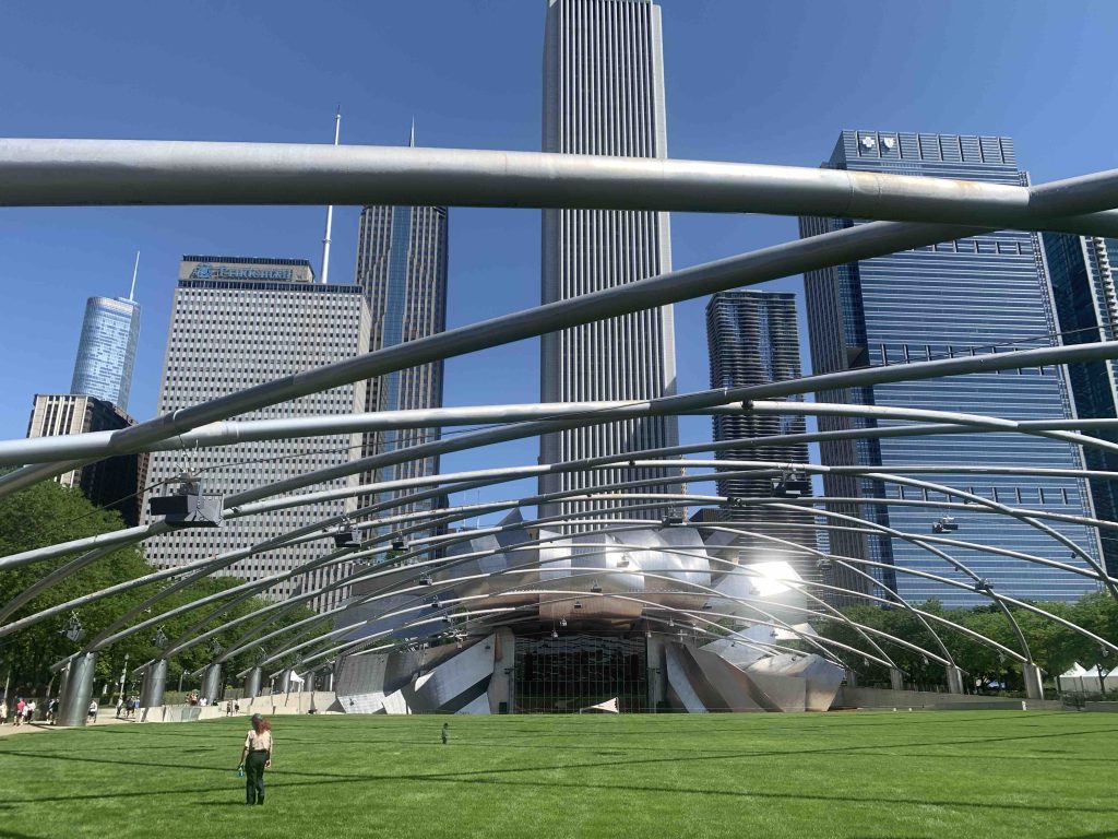 Mostly the city has exceeded my (exceptionally high) expectations, but there have been a couple of modest disappointments. The area around Anish Kapoor’s great public artwork Cloud Gate, 2004, is closed off for building work, and we couldn’t get very close. But this sense was off-set by encountering the Jay Pritzker Pavilion next door, designed by Frank Gehry.