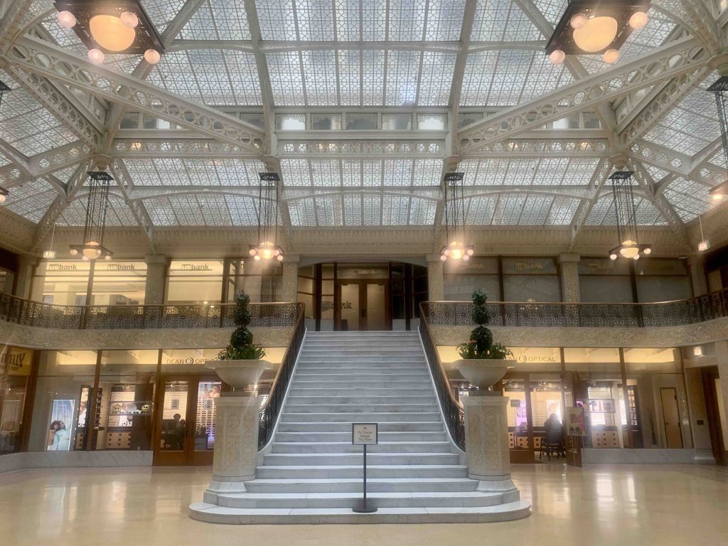 John’s passionate investment ln the house made the tour intimate and delightfully personal. Monday morning, we had a shorter, more conventional tour of another building from the late 1880s, The Rookery, now regarded as the oldest high-rise structure in the city. Built as a speculative 11-story office block, with a magnificent interior court and skylight, it was given a makeover by Frank Lloyd Wright in 1905. Inevitably, there’s much more Frank to come on this tour.
