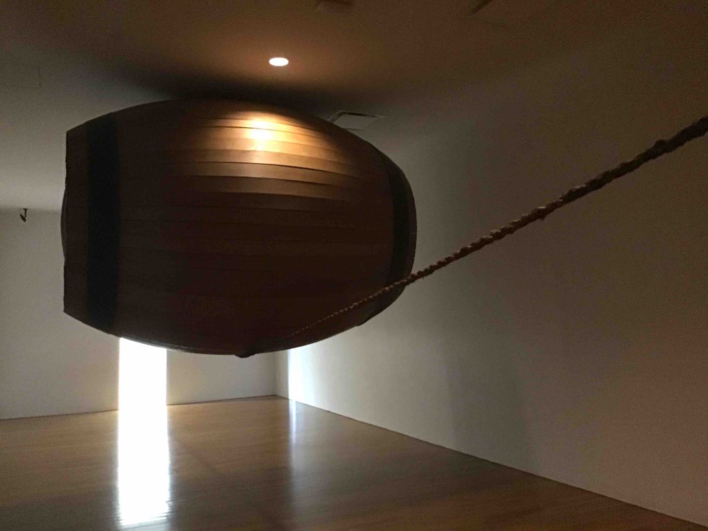 In another dedicated space, there’s Mel Chin’s Spirit, 1994, an uncannily balanced cask on a rope of tallgrass. A native plant, tallgrass was once key to the prairie ecosystem, but by 1930 was decimated by agricultural and industrial settlement. Barrels were fundamental for the process of European settlement in North America, Like the very best art, Spirit is wondrous, unsettling, provocative, sensuous (the smell of the tallgrass is important) and beautiful.