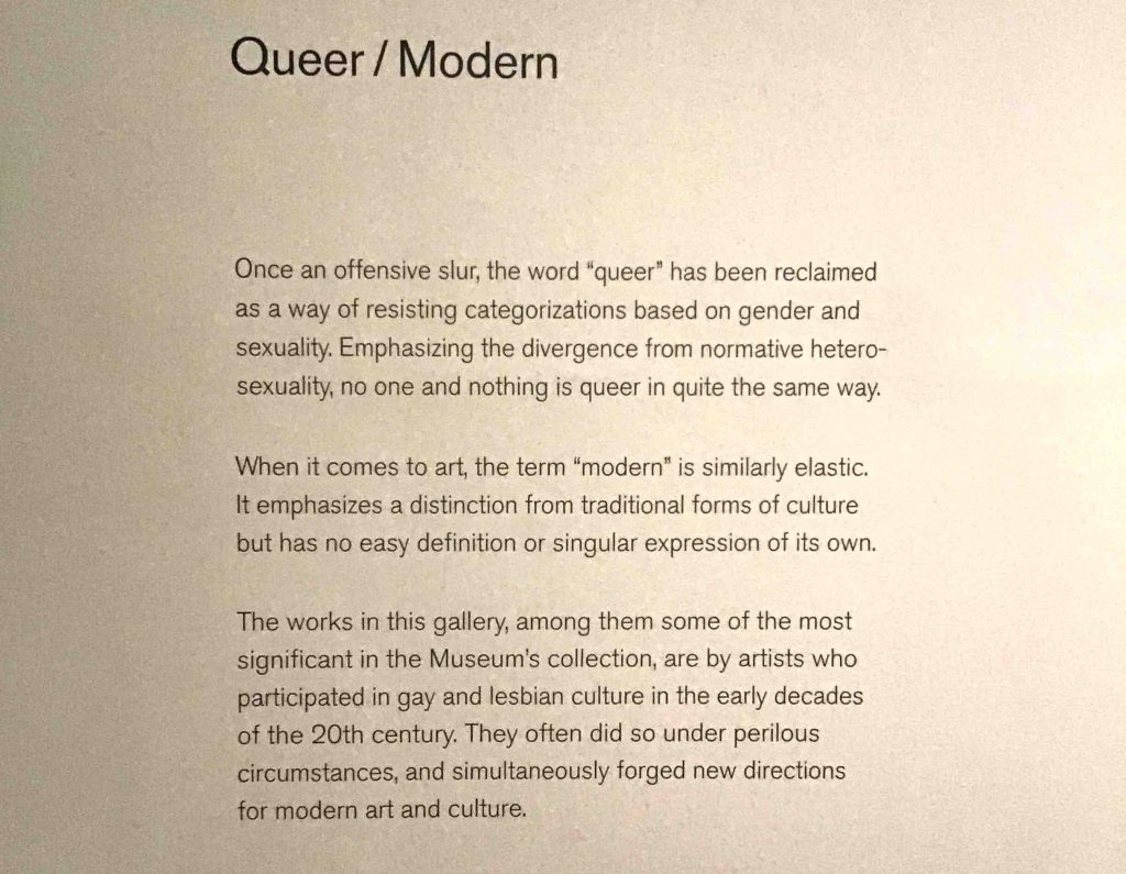 I can’t think of another major collection that has a dedicated display like this, drawing together works by Marsden Hartley, Paul Cadmus, Charles Demuth (on the wall below), Berenice Abbott and others.
