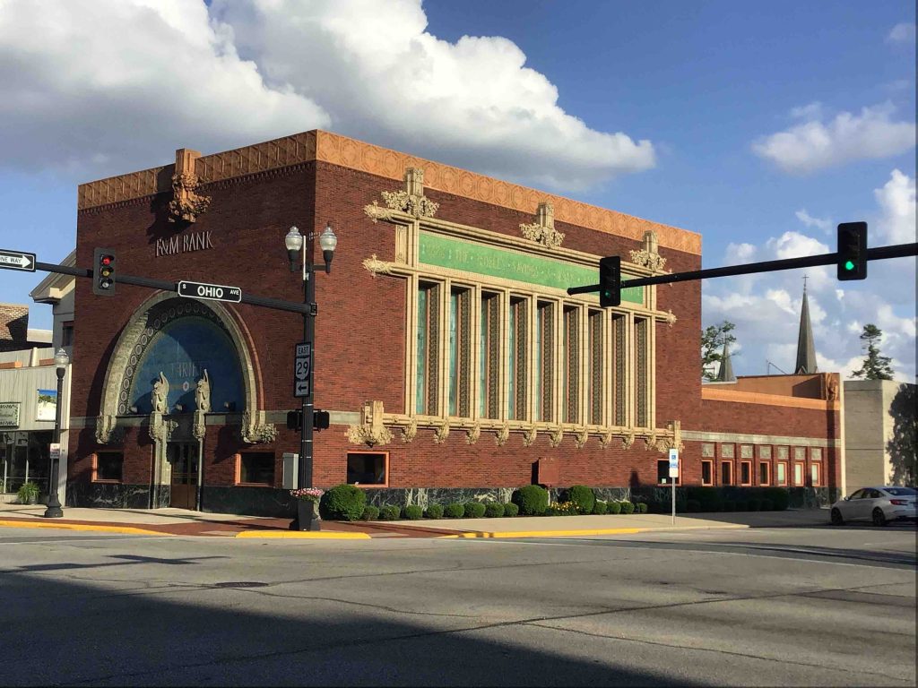 By six or so in the evening, despite frequent blasts of The Boss, we were tired and a touch car-sick, and we needed Sidney, Ohio, to lift our spirits. As it definitely did, specifically with the modest building we had come all this way to see: The Peoples Federal Savings and Loan Association, designed by Lous Sullivan and built 1917-18. My, this is a wonder, and it looked especially glorious in the late afternoon sun.