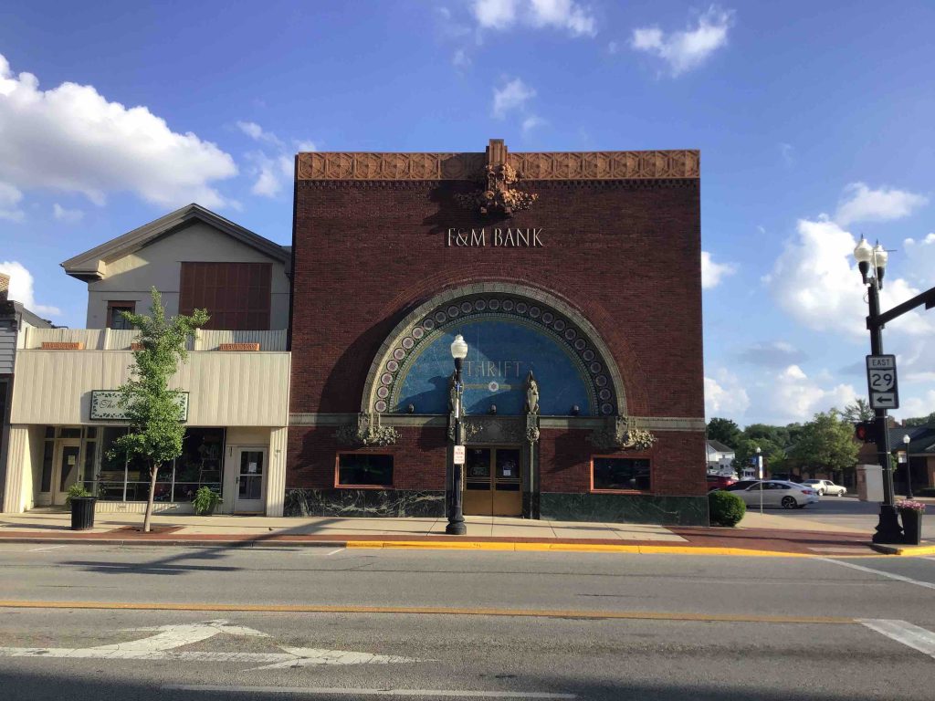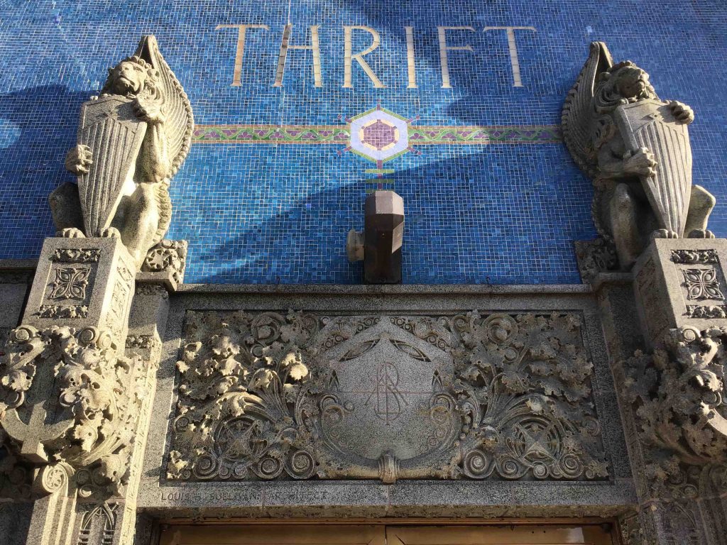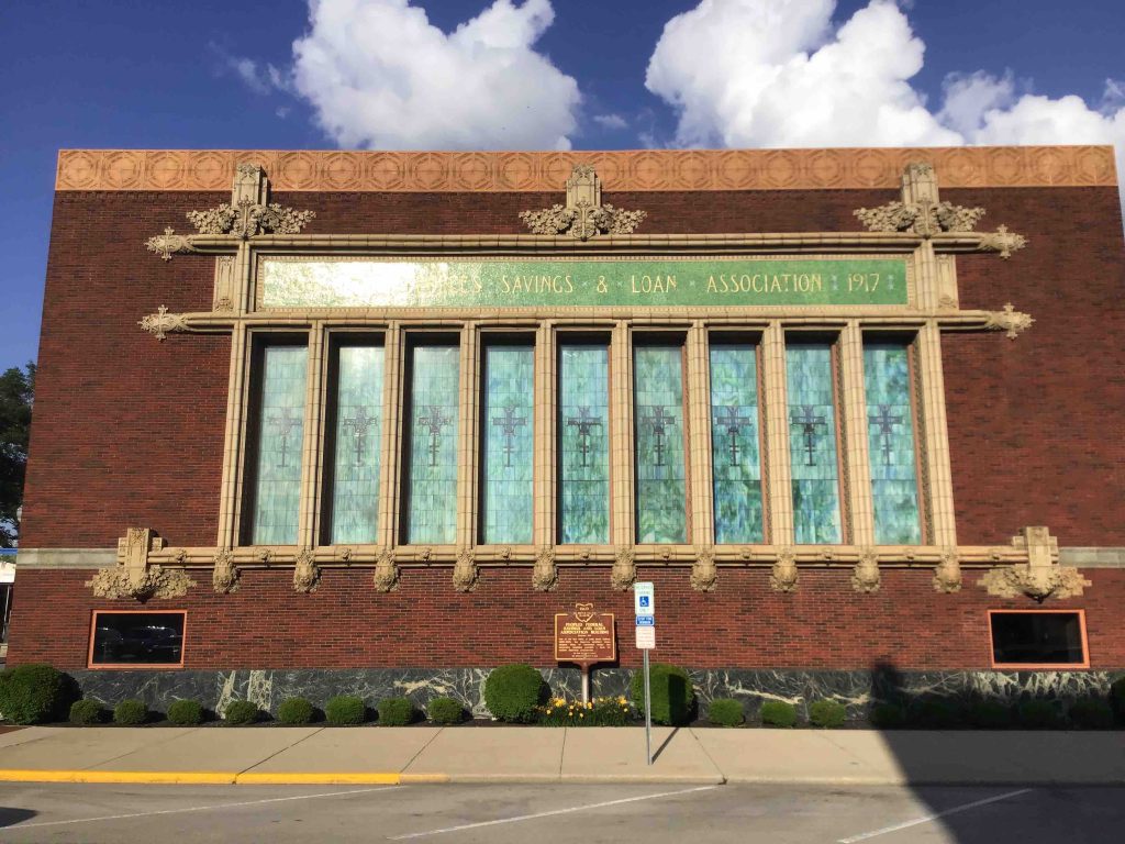 This is one of the eight banks in small mid-west towns that Sullivan designed towards the end of his illustrious career when major commissions were hard to come by (know the feeling, Louis). They are collectively called the “jewel box” banks because of their rich ornamentation, and the wonders of this one include the golden “Thrift” on the mosaic facade and the mottled green and blue stained glass windows along the side.