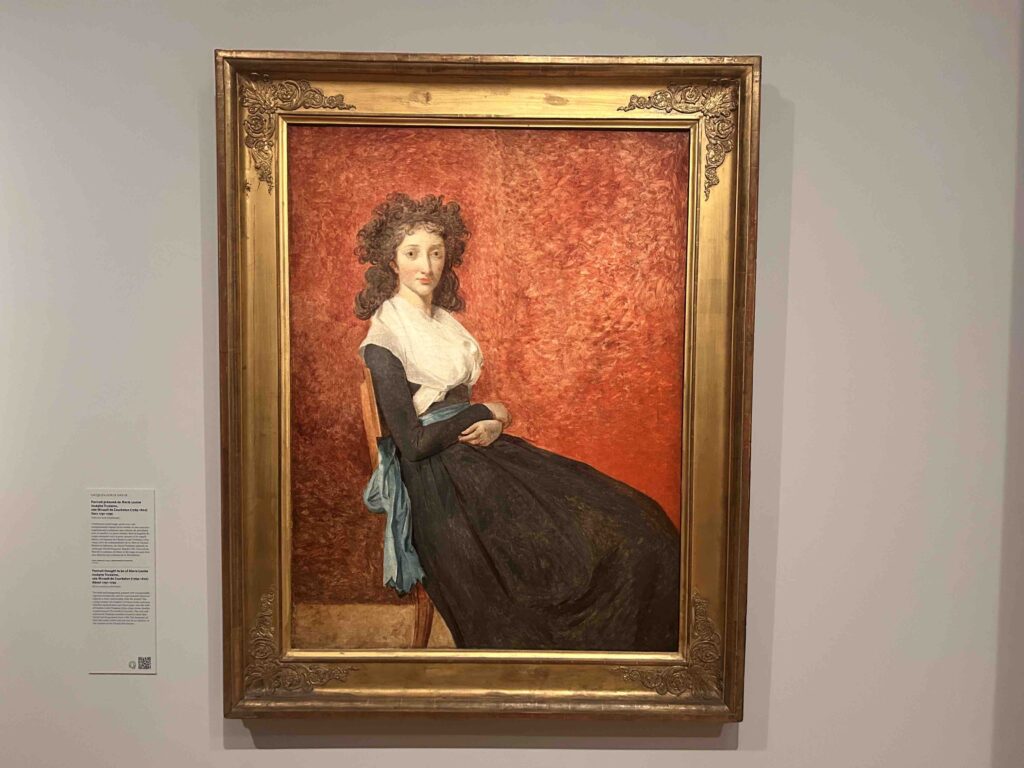 One other canvas that entranced me her was the extraordinarily modern-looking (and unfinished) Portrait thought to be Marie Louise Josèphe Trudaine, below, about 1791-92. Her enigmatic features, the astonishing highly worked ground, and the powerful use of the Revolution’s red, white and blue held me transfixed.
