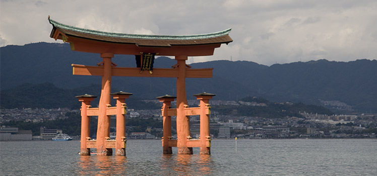 The shrine dates from the 6th century but the present buildings were constructed in the 12th. The shrine is built out over the bay. Commoners used not to be allowed to set foot here, but now hundreds of thousands of tourists come, in part to see the dramatic torii or gate which, at high tide, appears to be floating in the sea. The view with Mount Misen behind is officially designated as one of the Three Views of Japan.