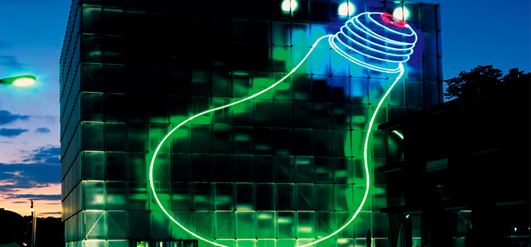 In 1973 Michael Craig-Martin exhibited a glass of water on a shelf, together with a printed text, and called the work An Oak Tree. As the text explained, the artist had changed the glass of water into an oak tree. More than thirty years later, Craig-Martin creates – along with screen-savers, works on LCD monitors and conventional paintings – gloriously colourful environments with blown-up outline images of domestic objects.