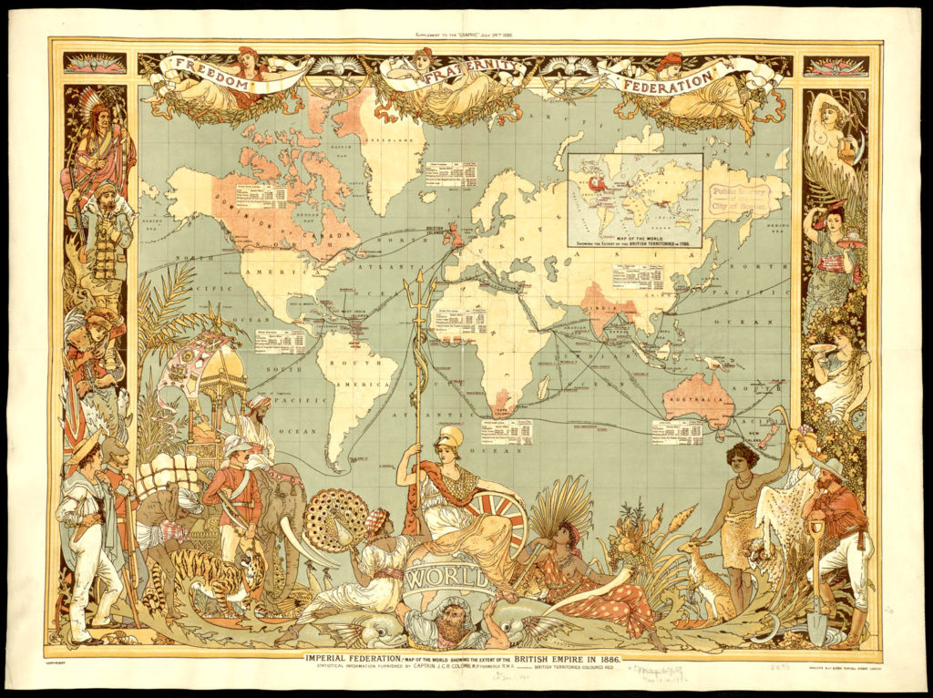 Header image: Imperial Federation Map of the World Showing the Extent of the British Empire in 1886, colour lithograph published by McClure and Co., 1886; via flickr, courtesy Boston Public Library.
