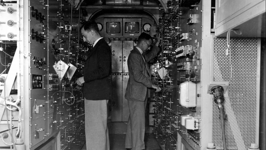 First of all there was no convenient supply of electricity. Another difficulty was that Wimbledon is a long way from the underground cable linking key-points of London to Alexandra Palace. Two additional vehicles had to be used to remedy these deficiencies — a transmitter van, and a van containing a six-cylinder petrol engine to generate power… The Wimbledon broadcast utilised all three vans, and marked the first transmission with a complete radio link. The vision signals and sound signals had to be sent by radio to Alexandra Palace for re-transmission to viewers, and electrical power to do this had to be generated on the spot.